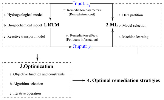 The framework for screening and optimizing remediation strategies for a contaminated site comprises three key components: RTM, ML, and optimization (Figure 2). The RTM is used to simulate the fate and transport of contaminants under various remedial conditions. The results include remediation effects (Figure 2, Yi), such as the residual soil contaminant volumes, groundwater contaminant concentrations, and contaminant discharges to nearby rivers, and remediation parameters (Figure 2, xi), such as the locations and volumes for the implementation of different remediation technologies, the types or concentrations of remediation reagents, etc., that are related to the cost of a remediation strategy. The results are used to train an ML model with a goal to establish the relationships between remediation parameters and remediation effects. The relationships are then used by an optimization algorithm to identify optimal remediation strategies under various constraints of site-specific remediation requirements. The framework is general and can be applied to any contaminated site.