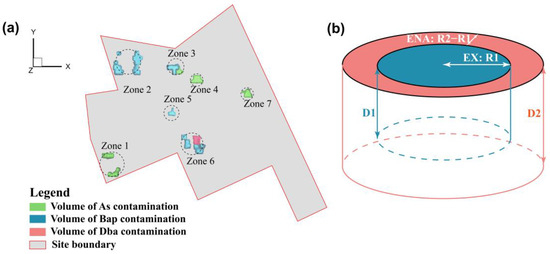Illustration of (a) 7 remediation zones and (b) remediation variables for each remediation zone where the center region with a radius R1 and depth D1 is to be treated with EX, the region from R1 to R2 with a depth of D2 to be treated with ENA, and the remaining contaminated soil outside R2 to be treated with MNA in each zone.
