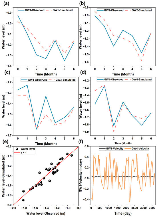 Observed and simulated groundwater levels at (a–d) individual monitoring wells, (e) all observed and simulated data, and the simulated groundwater velocity at monitoring wells (f) GW1 and GW4.