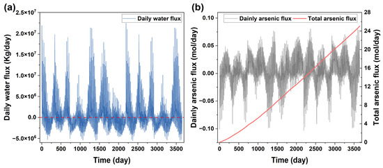 The flux of water (plot (a)) and As (plot (b)) from the site to the river.