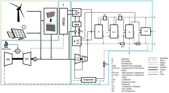 Figure 1, the proposed integrated system comprises three principal subsystems: the integrated MED, absorption heat pump (ABHP), and vapor compression refrigeration (VCR) subsystem, collectively referred to as the MAV subsystem within this study. Additionally, it includes a combined heat and power (CHP) subsystem, and a hybrid renewable power (HRP) subsystem equipped with battery and hydrogen storage options, denoted HRP/BH. The MAV subsystem, presented in a blue polygon in