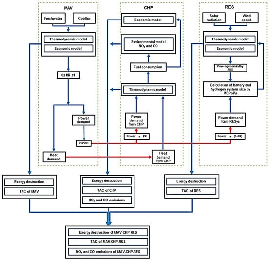 Figure 2 shows the computational framework of the proposed model, which integrates thermodynamic, environmental, and economic models for each subsystem to calculate overall exergy destruction, total annual costs (TACs), and hazardous emissions. As indicated in the figure, the rate of cooling and freshwater production is influenced by the refrigerant ratio within the MAV subsystem. The power demand dictates the sizing of the CHP and HRP/BH subsystems based on the power ratio (PR). The red arrows show the critical variables calculated while simulating a subsystem and used in modeling other subsystems. Following the management strategy outlined in