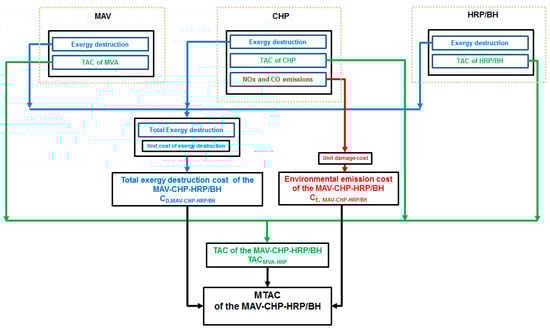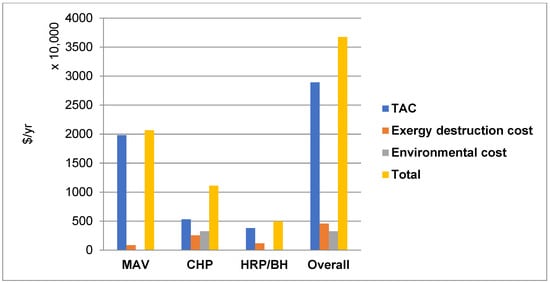 Figure 9 illustrates the influence of each subsystem on each term of the MTAC. According to the figure, the TAC, exergy destruction cost, and environmental cost of the optimal MAV-CHP-HRP/BH system are