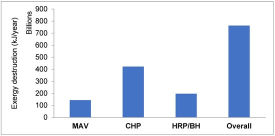 12]. This result can be attributed to the transfer of heat at high temperatures alongside other irreversible processes in the CHP components. On the other hand, the MED unit destroys an average of only 13% of fuel exergy during desalination [