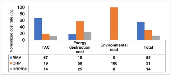 Figure 10 illustrates the normalized cost rate for MAV, CHP, and HRP/BH. The MAV subsystem accounts for 67% of the TAC, while CHP and HRP/BH contribute 19% and 14%, respectively. In terms of exergy destruction cost rates, MAV, CHP, and HRP/BH represent 18%, 58%, and 25%, respectively. Hence, it can be inferred that MAV, CHP, and HRP/BH contribute 55%, 31%, and 14%, respectively, to the MTAC of the MAV-CHP-HRP/BH system. In