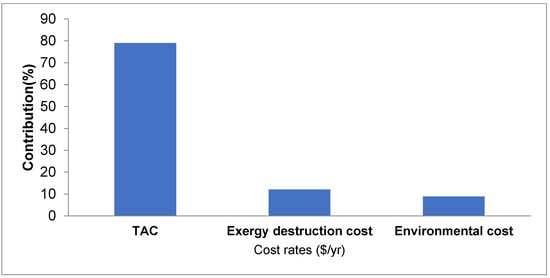 Figure 11, the normalized values of TAC, exergy destruction cost rate, and environmental cost rate on MTAC are presented. TAC emerges as the dominant contributor to MTAC, accounting for 79% of the total, followed by exergy destruction cost rate and environmental cost rate (with contributions of 12% and 9%, respectively). This result is a consequence of the high replacement and maintenance costs of the RHP/BH subsystem.