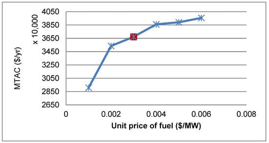 Figure 12 illustrates the impact of the unit price of fuel on MTAC. In the graph, the red marker denotes the optimal conditions obtained while a fuel unit price of USD 0.003 per MW was in effect. The plot reveals that MTAC increases with higher unit prices of fuel, indicating a direct correlation between fuel price and MTAC. Interestingly, as fuel prices rise, their influence on MTAC diminishes, whereas their impact is more pronounced at lower prices. This trend arises because as fuel prices rise, the contribution of the HRP/BH subsystem to power generation decreases relative to the CHP system, which relies on fuel for power generation. Consequently, increased fuel prices lead to reduced fuel consumption, thereby mitigating their effect on the MTAC of the MAV-CHP-HRP/BH system. Similar to a previous study [