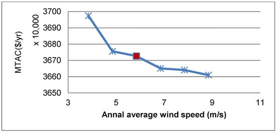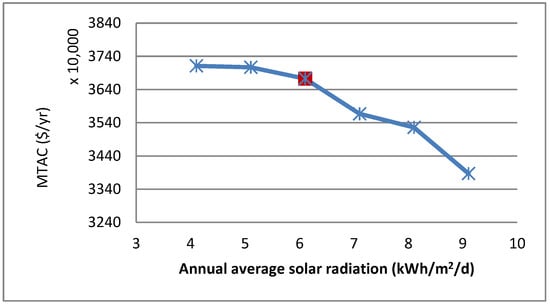 According to Equation (44), the sensitivity of the MTAC under optimum conditions was 0.22, 0.49, and 0.42, with respect to the fuel price, solar radiation, and wind speed, respectively. This indicates that solar radiation has the most significant impact on optimum MTAC and should be given greater consideration during the operation of the optimal combined system. Moreover, the proposed iterative thermo-econo-environmental modeling platform (