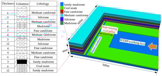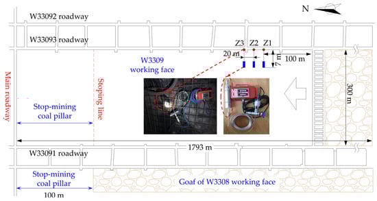 The mine operates with strike longwall integrated mechanized one-time full-height coal mining at W3309. W3309 is 6.0 m thick, 300 m wide, and 1793 m long, having a cover depth of about 412 m. The immediate roof of the coal seam is composed of soft to semi-hard sandy mudstone. The immediate floor is mainly composed of sandy mudstone. The roadway in the panel is arranged perpendicular to the working face along the east–west direction. Figure 1 shows the location of the main roadway in relation to W3309.