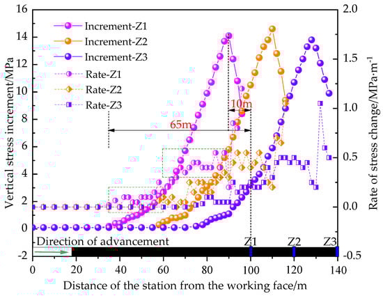 Figure 2 shows the characteristics of the FAP during mining. The maximum stress increments of the abutment pressure at measuring points Z1 to Z3 are 14.1 MPa, 14.6 MPa, and 13.8 MPa, respectively, with an average of 14.17 MPa. Taking measuring point Z1 as an example, the abutment pressure starts to show stress appreciation at 65 m from the working face. In the front range of 40~65 m from the working face, the stress increment increases slowly with the advance of the working face, and the average growth rate is 0.095 MPa/m, with an incremental value of 2.7 Mpa. In the front range of 10~45 m from the working face, the stress increment increases rapidly with the advance of the working face, and the average growth rate is 0.366 MPa/m, with an incremental value of 2.7 Mpa. The stress increment peaked at 14.1 MPa at a location 10 m in front of the working face. The stress increment in the range of 4~10 m from the working face to the measuring station shows a decreasing trend with the advancement of the mining face, and it is reduced to 9.9 MPa at a position of 4 m from the working face. Field measurement data indicate that the influence range of the FAP is 0~65 m.
