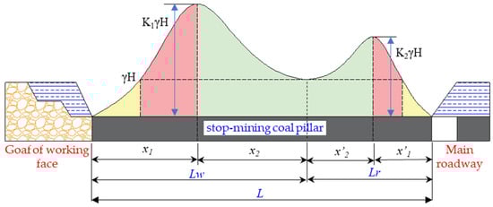 The rational width of the SMCP is an essential guarantee for maintaining the long-term stability of the main roadway. The SMCP undergoes three main stress stages during its service life: the main roadway excavation stress stage, the stress stage during working face mining, and the stabilized stress stage after the end of mining. After the main roadway is excavated, the original rock stress is redistributed and balanced to form a certain area of the stress field, which is not influenced by the pre-mining of the quarry. Compared with the excavation period, the SMCP is more strongly disturbed by the disturbance stress from working face mining. The deterioration in the surrounding rock conditions caused by mining stress is the fundamental cause of main roadway rock disasters. As the mining field continues to advance, the impact range of the FAP moves forward, and the range of the in situ stress between the mining field and the main roadway gradually decreases, thus disturbing the pressure field of the MRSR. Based on the limit equilibrium theory and engineering practice [29,30], when the main roadway has just been disturbed, the width of the SMCP is the sum of the excavation stress field range Lr of the main roadway and the range Lw of the FAP (Figure 3).