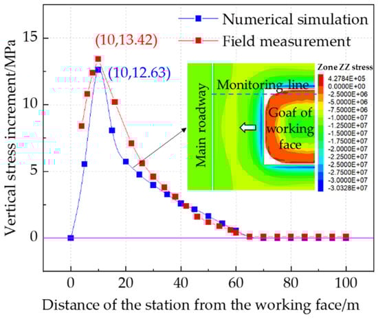 To improve the precision of the constructed numerical model, the actual mining parameters in the field were used to simulate the working face advancement. The extraction and processing to obtain the characteristics of the FAP increment at the same location as measured in the field are shown in Figure 5. The trend of the FAP curves obtained from both research methods, field measurement and numerical simulation, is consistent. The stress increments all peaked at 10 m in front of the working face and were 13.42 MPa and 12.63 MPa, respectively, with a difference of 0.7 MPa. The fact that the difference in stress increment at the same position is kept between 0 and 1 MPa indicates the rationality and reliability of the constructed numerical model.