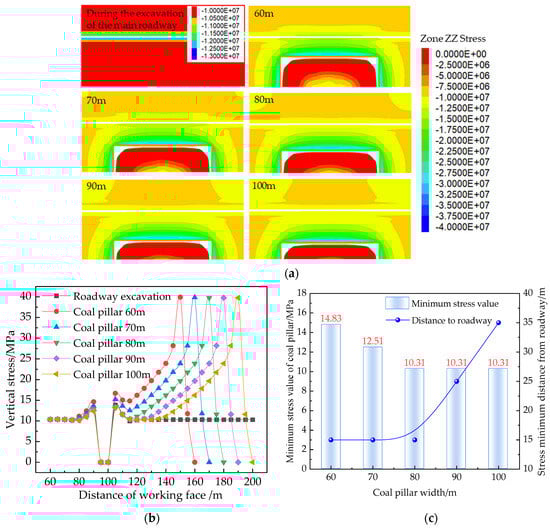 Stress characteristics of SMCPs at different widths: (a) stress cloud map; (b) stress distribution curve of SMCPs; (c) distribution characteristics of the lowest stress point in the elastic zone of coal pillars.