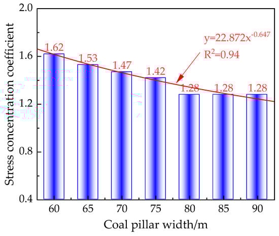 The relationship between the maximum VSCC of the main roadway disturbed by mining and the SMCP width is shown in Figure 7. When the width of the SMCP is lower than 80 m, the maximum VSCC of the main roadway increases gradually with the decrease in the SMCP width. When the width of the SMCP decreases to 60 m, the maximum VSCC increases from 1.28 to 1.62, showing that the stress field of the MRSR is enhanced gradually by the influence of FAP, and the MRSR is going to become unstable gradually.