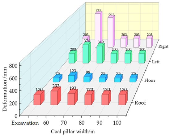 The deformation features of the main roadway under the influence of excavation and mining are shown in Figure 8. After the main roadway was excavated, the damage of the SRMR was dominated by the movement of the two sides, and the deformations of the roof and floor and the two sides were 170, 75, 200, and 203 mm, respectively. When the coal pillar width exceeds 80 m, the deformation amount of the roadway is basically the same as that after the stabilization of the excavation, and working face mining has no impact on the roadway. As the coal pillar width decreases to 70 m, the deformation of the roadway increases sharply. At this time, the deformations of the roof, floor, and two sides were 193 mm, 98 mm, 349 mm, and 661 mm, with increases of 14%, 30%, 74%, and 229%, respectively, indicating that the working face mining at this time had a significant impact on the main roadway. When the SMCP width continued to decrease to 60 m, the deformation of the MRSR continued to increase.