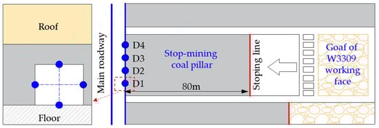 To assess the reasonableness of coal pillar retention, four measuring stations (D1~D4) were arranged at intervals of 60 m in the main roadway, and the cross-point method was used to continuously monitor the deformation of MRSR after the end of mining. The monitoring station arrangement is shown in Figure 9.