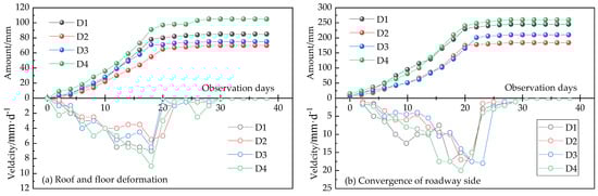 The deformation characteristics of the MRSR after the working face stopped mining are shown in Figure 10. During the monitoring period, the continuous deformation of the MRSR lasted for approximately 28 days, which can be divided into three distinct periods. Taking the D1 measuring point as an example, in the first time period of 0~10 days for the slow deformation stage, the roof-to-floor and side-to-side convergences are 18 mm and 75 mm, and the maximum movement rates were 3 mm/d and 10 mm/d, respectively. The second time period of 10~20 days is the rapid deformation stage; the roof-to-floor convergence is 62 mm, the convergence of the two sides is 155 mm, and the maximum movement rates were 7 mm/d and 17.5 mm/d, respectively. The third time period from 20 to 28 days is the slow deformation stage; the roof-to-floor convergence is 7 mm, the convergence of the two sides is 15 mm, and the maximum movement rates were 0.5 mm/d and 1 mm/d, respectively. After that, the deformation of the MRSR stabilized, and the amount of displacement no longer increased. The maximum roof-to-floor and side-to-side convergences of the main roadway are 105 mm and 260 mm, and the overall deformation of the surrounding rock is small, which indicates that the width of the SMCP must be 80 m to meet the needs of safe production.