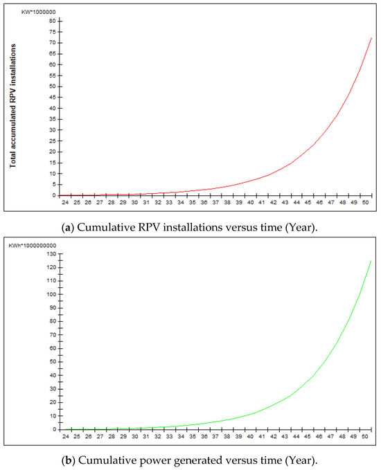 The proposed model shown in Figure 4 was run by simulation using Powersim Studio 5 Software to predict the expected RPV installations (KW), generated power (KWh), and CO2 emission reduction (kg·CO2) during the years 2024 to 2050. Table 1 displays the general input parameters of the proposed system dynamics model. Table 2 displays the main parameters of the satisfaction model.