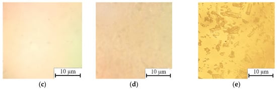 Figure 3 shows photographs of the original betulin and its solutions in the mixed solvent of 50 wt.% DMSO/50 wt.% ethanol. Solutions with different concentrations have been obtained on a heated magnetic stirrer, and dissolution temperatures have been detected. The morphology of the solutions and betulin particles was studied by optical methods (Figure 3c–e).