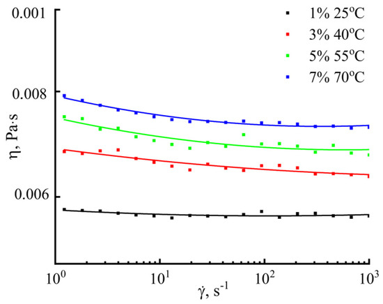The obtained time dependencies reveal that the system viscosity remains stable for 20 min, implying that the solution composition varies slightly. This time, the interval is sufficient to obtain traditional flow curves for solutions with different contents of betulin (Figure 6).
