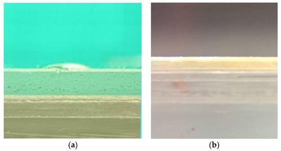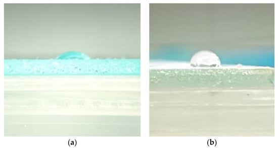 All the obtained flow curves have a similar character. The Newtonian behavior dominates at low and high shear rates, where the viscosity is independent of the shear rate. An increase in the content of betulin in the system leads to a proportional growth in viscosity values. It is important to notice that the viscosity of the initial complex solvent at ambient temperature differs slightly from that of betulin solutions at temperatures where it is completely dissolved. The contact angle for surface water wetting was determined using the drop’s profile. To compare, we utilized a glass plate and the same plate with a thin layer of betulin (Figure 7).