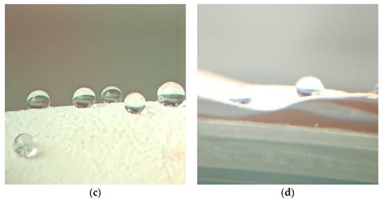 Photographs of water droplets on the surface of cardboard (white liner) (a,c) and kraftliner (single-layer, 2 K-90) (b,d) before (a,b) and after (c,d) application of betulin.