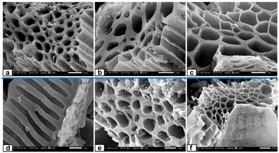 Different magnified SEM micrographs of the microstructure of the biochar surface at different zones, where (a,c,e) are anterior views (cross-sections) and (b,d,f) lateral (longitudinal) and mixed views.