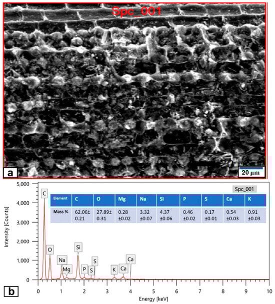 Figure 2 presents the elemental composition of the biochar, as determined through EDX analysis conducted in conjunction with SEM imaging of the sample subjected to the two-step pyrolysis process. The EDX spectra reveal that carbon and oxygen are the predominant elements within the biochar, complemented by the presence of silicon, sodium, potassium, calcium, phosphorus, and sulfur in minor quantities. Notably, the carbon content of the biochar registers as the highest mass value, a characteristic attributed to the two-step pyrolysis process and the elevated pyrolysis temperature of 600 °C. This higher temperature facilitates the dehydration and volatilization processes, resulting in an increased carbon content and a corresponding decrease in oxygen and other elements.