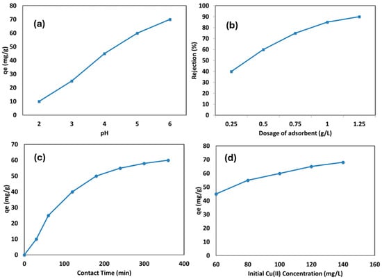 The effect of pH, dosage, contact time, and initial concentration on Cu (II) removal. Conditions: (a) pH = 2–6, adsorbent dosage = 1 g/L, Cu (II) concentration = 100 mg/L, contact time = 360 min, shaking speed = 150 rpm, reaction temperature = 25 °C; (b) adsorbent dosage = 0.25–1.25 g/L, pH = 5, other conditions as in (a); (c) contact time = 0–360 min, pH = 5, other conditions as in (a); (d) Cu (II) concentration = 20–100 mg/L, pH = 5, other conditions as in (a).