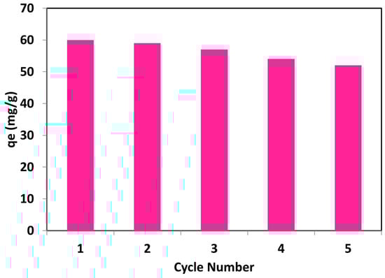 The reusability of biochar as an adsorbent for Cu (II) was evaluated over five consecutive adsorption–desorption cycles to assess its stability and reusability. The adsorption–desorption experiments were conducted using 0.1 M HCl as the eluent for desorption of Cu (II)-loaded biochar. The adsorption capacity (qe) of the biochar was measured after each cycle to determine the effectiveness and stability of the biochar over repeated uses. As shown in Figure 7, the adsorption capacity of biochar for Cu (II) slightly decreased with each consecutive cycle. Initially, the adsorption capacity was 60 mg/g, which dropped to 58 mg/g in the second cycle, 56 mg/g in the third cycle, 54 mg/g in the fourth cycle, and finally 52 mg/g in the fifth cycle. This gradual decrease in adsorption capacity indicates some loss of efficiency over multiple cycles, but the biochar still retained a significant adsorption capacity throughout all cycles. The slight reduction in adsorption capacity can be attributed to several factors, including a potential loss of active adsorption sites and structural changes in the biochar after repeated use. However, the biochar’s ability to maintain over 85% of its initial adsorption capacity after five cycles demonstrates its potential for practical applications in wastewater treatment.