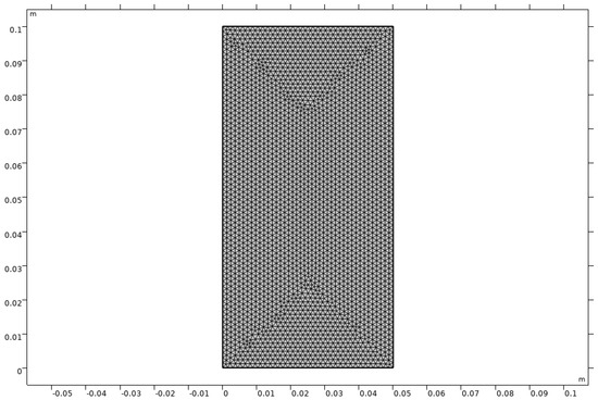 The new modified damage constitutive model was used to calculate the rock damage parameters, and the damage propagation and evolution characteristics were simulated by Comsol software. The established two-dimensional model had a size width of 50 mm, a height of 100 mm, a pore pressure of 3 MPa, a confining pressure of 5 MPa, and a grid number of 5949 units, as shown in Figure 2. The solid mechanics and seepage modules were added to simulate the damage characteristics under the fluid-structure coupling, and the simulated stress-strain data were compared with the experimental data to verify the accuracy of the modified constitutive model. The rock mechanical parameters necessary for the fluid-solid coupling numerical simulation were sourced from experimental data, with the elastic modulus being 5.02 GPa and the Poisson’s ratio being 0.2207, with other parameters presented in Table 2.
