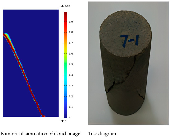 Figure 3 illustrates the damage pattern of rocks under the simulation of fluid-solid coupling using the newly developed damage constitutive model. To simulate the mechanical characteristics of the core under the coupling of fluid and solid, a two-dimensional rectangular core model domain with dimensions of 50 mm × 100 mm was established. The bottom of the model is fixedly constrained with a confining pressure of 8 MPa, while the top is subjected to a loading velocity of 0.05 MPa/s, with a pore pressure of 3 MPa. For further details regarding other parameters, please refer to Table 2. According to the simulation results, under uniaxial compression, cracks in the rock propagate along the diagonal direction, while under shear compression, cracks formed in the interlayer rock penetrate through the rock, eventually forming a shear fracture surface. A comparison with the experimental core fracture images indicated that the numerical simulation results were in good agreement with the observed fracture patterns.