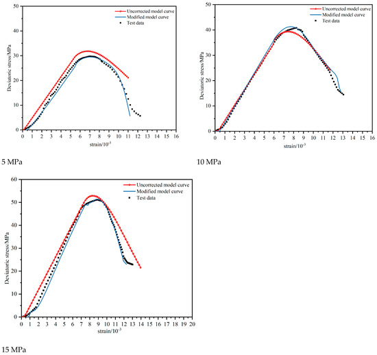 Based on Equations (9) and (10), a segmented constitutive model is established by introducing the correction parameter , as shown in the following equations: