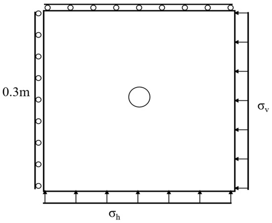 Figure 6 presents the cross-sectional model of the wellbore. This model depicts a square domain with dimensions of 0.3 m on each side, featuring a wellbore model with a radius of 0.015 m at the center. The top and left boundaries are supported by rods, subjected to lateral loads of 10 MPa and longitudinal loads of 15 MPa. The domain is discretized into 58,480 triangular mesh elements, with a maximum element size of 0.00201 m. The model’s elastic modulus is 5.02 GPa, and the Poisson’s ratio is 0.2207. Other property parameters are detailed in Table 2.