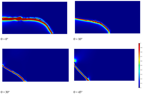 Due to the influence of factors such as formation dip angle, drilling techniques, and wellbore trajectory, there is a certain angle θ between the perforation hole and the formation during pre-fracturing perforation. In order to study the damage evolution patterns on the interlayer caused by the fracturing expansion process under different angles θ, we assume θ to be 0°, 10°, 30°, and 45°, respectively. The crack propagation patterns under different angles are shown in Figure 7, indicating that the total length of crack propagation decreases as the angle increases.