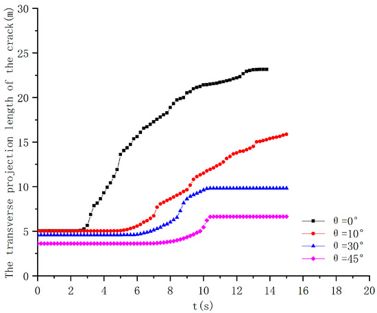 Figure 8 and Figure 9 depict the vertical and horizontal evolutionary curves of cracks under different angles, respectively. It can be observed that with larger angles, the cracks penetrate the interlayer earlier. In the fracturing process of oil wells in Zone Z, the vertical propagation of fractures is prone to penetrate interlayers and connect with adjacent water layers, leading to fracturing failure, water channeling in oil wells, and water flooding. Consequently, for reservoir intervals with larger angles, it is necessary to adjust the fracturing scale and reduce the injection volume of fracturing fluid to prevent interlayer fracturing during the fracturing process.