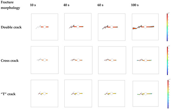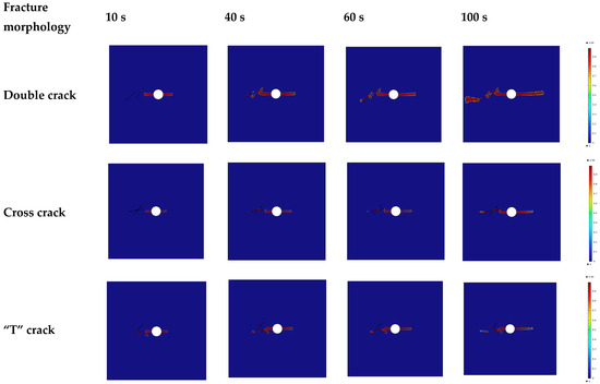 To investigate the influence of different types of natural fractures on hydraulic fracturing crack propagation, the boundary pressure σv was set to 15 MPa and the boundary pressure σh was set to 10 MPa. According to Figure 10, in the parallel double-fracture model, when the fracture propagates through the double fractures, it sequentially communicates with the fractures. The damage evolution rate within natural fractures is significantly higher than within the reservoir. When damage evolution occurs in intersecting fractures to the point of reaching natural intersecting fractures, the expansion mainly follows the natural fractures in the horizontal direction. The angle of horizontal natural fractures affects the path of damage evolution. In the “T” shaped fractures, after the fracture communicates with the T-shaped natural fracture, it mainly branches out along the bottom of the natural fracture, transforming the natural crack into a bridge for lateral expansion of artificial fractures. From the influence of different types of natural fractures on fracture propagation, it is evident that the distance of artificial fracture expansion is mainly related to the horizontal extension length of natural fractures. Natural fractures serve as pathways in the propagation path of artificial fractures. When damage evolution passes through natural fractures, it continues to expand horizontally. However, the lowest position of natural fractures in the direction of fracture propagation becomes the new starting point for horizontal expansion of damage.