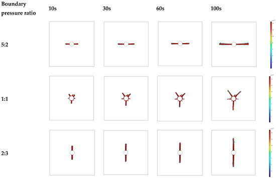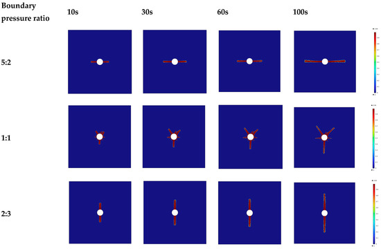 To investigate the influence of boundary pressure on the evolution pattern of damage around oil wellbores, longitudinal boundary pressures were set at 10 MPa, and lateral boundary pressure were respectively set at 4 MPa, 10 MPa, and 15 MPa. Different longitudinal and transverse pressure ratios were established at ratios of 2:5, 1:1, and 3:2, respectively. According to Figure 12, when the pressure ratio is 2:5, damage near the wellbore extends in a single direction, forming a single horizontal fissure during the pressure process. When the pressure ratio is 1:1, damage spreads around the wellbore, forming three distinct primary fractures during the process of damage evolution. When the pressure ratio is 3:2, damage evolves and extends in the vertical direction, forming a single fracture. It can be concluded that the evolution direction of fractures around the wellbore during hydraulic fracturing is primarily related to the longitudinal and transverse pressure ratios on the cross-section of the wellbore.