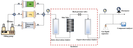 This slim tube experiment uses a SYS-III multi-stage high-temperature and high-pressure two-phase displacement system, incubator, ISCO-26 fluid pump, long slim tube, precision pressure gauge, six-way valve, gas–liquid separation device, and MC gas meter, The experimental flow chart is shown in Figure 1. Prior to the experiment, the long slim tube’s volume was calculated using Boyle’s equation, and its porosity and permeability upon sand loading were measured using N2. The measurements of the long slim tube were 0.458 cm in diameter, 1251 cm in length, and 206.1 cm3 in volume. Its pore volume is 76 cm3 and its permeability is 5.3 D.