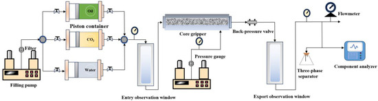 The long core displacement physical simulation experiment can replicate the oil layer to the greatest extent possible while maintaining geometric similarity with the reservoir, as well as investigate the recovery scenario under various miscibility levels under actual reservoir conditions. The equipment utilized in this long core experiment is separated into three categories: an injection system, a core holder, and an extraction system. The three systems are independent plate structures. The injection system includes an input drive replacement pump, a perpendicular pump, three piston containers (for oil samples, CO2 atmospheric samples, and ground water samples, respectively), and an extraction system with a voltage valve, a flow meter, a three-phase separator, and a gas phosphate spectrometer. The experimental procedure is depicted in Figure 2.