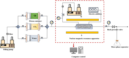 Nuclear magnetic resonance T2 testing (NMR) and nuclear magnetic resonance imaging (MRI) scanning can figure out the relationship between the peak value and relaxation time of the “H” fluid signal contained in the core at various intervals and provide visual imaging of the fluid-swept area. The nuclear magnetic resonance high-temperature and high-pressure online displacement system consists of three subsystems. ① The first is a constant-temperature oil bath-heating cycle ring pressure control system. Fluorine oil is used to circulate around the core holder to control the experimental temperature, and the annular pressure pump is used for pressure feedback adjustment to simulate the high-pressure environment of the formation. ② Fluid displacement simulation system. This is made up of a constant speed fluid pump (ISCO pump), a core device, a gas–liquid separation device, and other components that can move oil, water, gas, and other multi-phase fluids. This system controls back pressure at the gripper’s end. ③ The online nuclear magnetic experiment system can collect the fluid signal in the rock sample’s nanoscale pore throat while also correctly observing variations in the fluid signal amount in the core pore throat at various displacement moments. Figure 3 illustrates the experimental approach.
