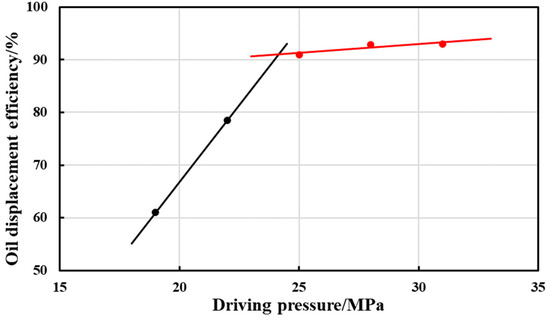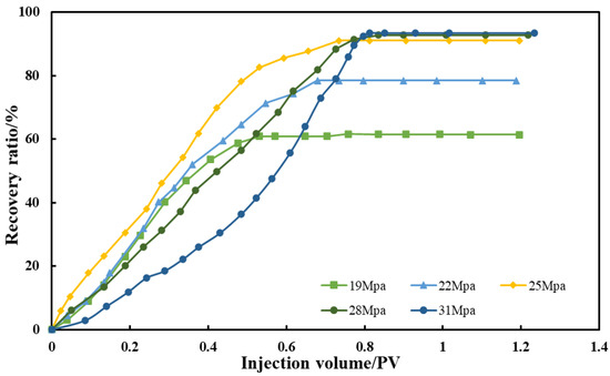 Because it is difficult for CO2 and crude oil to form a miscible phase at 18 MPa on the slim tube scale, the experimental group with a back pressure of 18 MPa was considered an immiscible CO2 oil displacement. The experimental results are depicted in Figure 7 and Figure 8. The oil displacement efficiency curve in Figure 7 exhibits typical immiscible displacement features, implying that it is difficult to achieve miscibility at 18 MPa at the core scale, which is consistent with the slim tube experimental results, but with lower oil displacement efficiency. This is because of the filling. Long, thin sand tubes have more uniform porosity, permeability, and composition, whereas genuine cores vary in oil and water occurrence, homogeneity, and lithology. With the results, we believe that when the research scale advances, the minimum miscible pressure of CO2 will rise to a certain point.