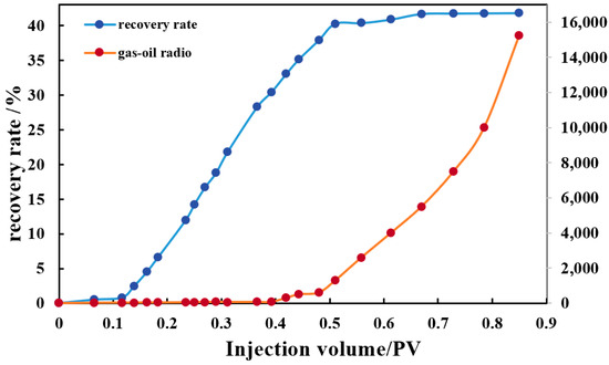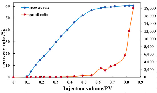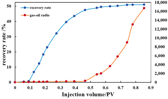Relationship between injection volume, recovery, and gas–oil ratio under near-miscible condition.