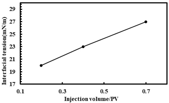 The study measured the oil–water interfacial tension of oil samples at the exit at various stages. The results in Figure 14 show that in the stage before seeing gas, interfacial tension increases with miscibility and decreases with CO2 input. Following gas breakthrough, the generated oil’s interfacial tension rapidly falls, and the higher the degree of miscibility, the greater the decline. In this experiment, the interfacial tension and oil component variations demonstrated a strong association. When the heavy components in the generated oil increase, so does the intermolecular contact force, which causes an increase in interfacial tension. The decrease in interfacial tension demonstrates that CO2 can extract the lighter part of the reservoir crude oil via extraction, which can improve the crude oil’s flow performance to some extent and increase the production effect.