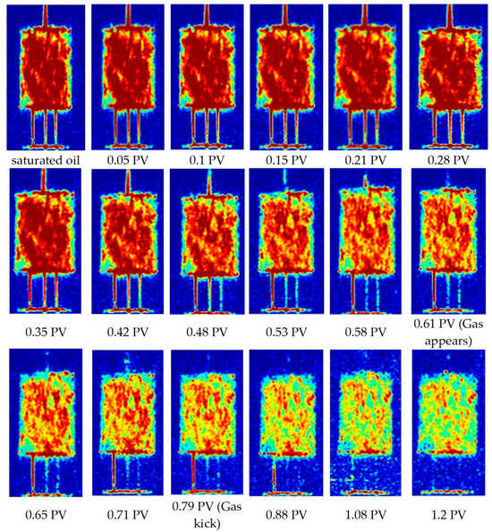The NMR imaging results during the CO2 displacement process are shown in Figure 15. The displacement process can initially be divided into three stages. The slow oil production at the outlet end is the initial stage of displacement, the oil production at the outlet end rapidly increases when gas is encountered (the system pressure increases rapidly) in the middle stage of displacement, and the final stage of displacement is when gas occurs and then gas kick. When gas injection is initiated in the early stages of displacement, the oil-bearing area marginally expands. At this point, CO2 is primarily dissolved, and crude oil and CO2 expand following the interaction. After that, the gas drive was quite consistent, with no apparent gas drive front. Oil saturation in the core steadily dropped, and the oil in the core’s big pores was gradually depleted. This demonstrates that due to the viscosity reduction and expansion effects caused by the dissolution of CO2 and crude oil, as well as changes in the properties of the oil–gas–water interface in the miscible state, crude oil is more likely to be used, and the gas-channeling breakthrough time will be delayed.