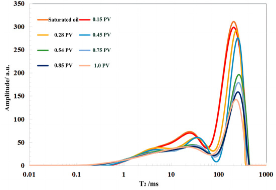 The online NMR experiment protocol is as follows: raise the experimental temperature to 65 °C, vacuum the core, pressurize the core to saturate it with formation oil, and apply aging treatment. Put the oil-saturated core in the holder, activate the displacement process, and displace the crude oil until it exits the outlet section. Stop the pump and allow the internal pressure of the core to balance. Test the T2 spectrum curve and nuclear magnetic resonance imaging scan while the oil is saturated. Calculate saturated oil volume and porosity using the gravimetric and nuclear magnetic methods. Under the mixed-phase pressure of 24 MPa, the high-pressure pump injects CO2 into the rock sample, keeping the experimental temperature and pressure unchanged under different injection volumes (0.05, 0.1, 0.15, 0.21, 0.35, 0.4, 0.45, 0.51, 0.56, 0.6, 0.62, 0.65, 0.71, 0.75, 0.81, 0.85, 1 PV; PV is the volume multiplier of the cavity gap) for nuclear magnetic resonance testing.