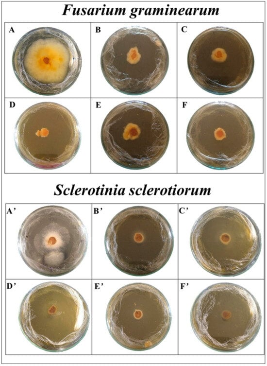 Inhibition of F. graminearum and S. sclerotiorum by matrix extracts of S. brasiliensis and S. viarum after 7 days of extract application. (A/A′). Ethanol + water (control); (B/B′) S. brasiliensis (extracts from stalk); (C/C′) S. brasiliensis (extracts from flowers); (D/D′) S. brasiliensis (extracts from leaves); (E/E′) S. viarum (extracts from fruits); (F/F′) S. viarum (extracts from roots).