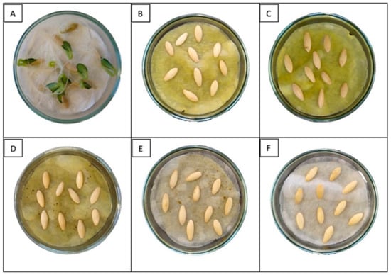 Germination inhibition of C. sativus seeds after 7 days of application of S. brasiliensis and S. viarum extracts. (A) Ethanol + water (control); (B) S. brasiliensis (extracts from stalk); (C) S. brasiliensis (extracts from flowers); (D) S. brasiliensis (extracts from leaves); (E) S. viarum (extracts from fruits); (F) S. viarum (extracts from roots).