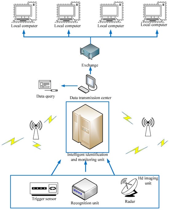 Object detection is a hot topic in machine vision perception tasks. In the dust suppression monitoring system for railway coal transportation, the personnel and equipment can play a role in safety supervision and early warning. The overall architecture of the railway coal transportation target detection model proposed in this article is shown in Figure 1. The monitoring system mainly consists of a high-definition imaging unit, an intelligent recognition monitoring unit, a data transmission center, and a user terminal. It can monitor the detection effect of the coal solidification layer in real time and detect abnormal states in the detection process in a timely manner. The monitoring system detects the status of the solidified layer through high-definition imaging equipment, transmits video or image information to relevant departments, and is able to capture and recognize locomotive numbers. The high-definition imaging unit adopts a dual-redundant structure to improve the reliability of information during image acquisition. At present, China’s 5G communication technology is developing rapidly, and long-distance transmission is achieved through 5G wireless communication technology.