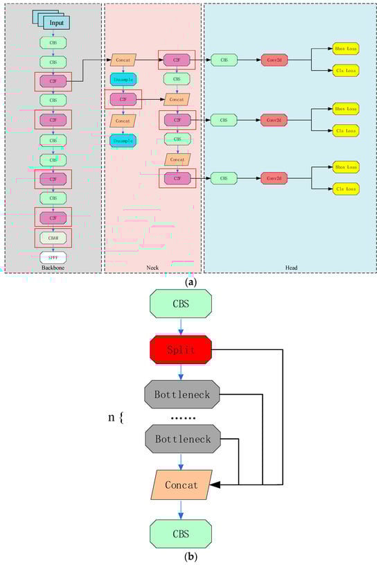 The network structure of YOLOv8 to be improved in this paper is shown in Figure 2a, and the improved part is marked in a red box. YOLOv8 is divided into the backbone, neck, and head.